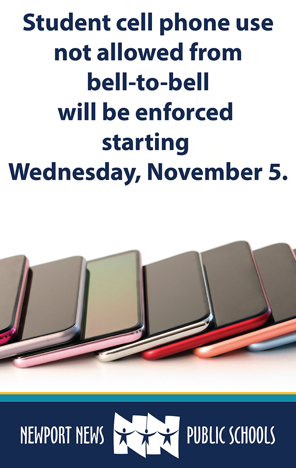 Starting November 5 in order to comply with state law, Newport News Public Schools students will not be allowed to use cell phones from the start of the school day to the end of the day, including during lunch and transition periods between classes.